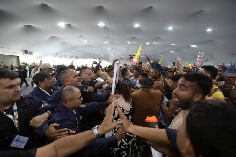 Logo na sequência, outros manifestantes carregando bandeiras de coletivos estudantis e faixas de protesto contra a exploração de petróleo chegaram ao espaço da Blue Zone e entraram em confronto com os seguranças.