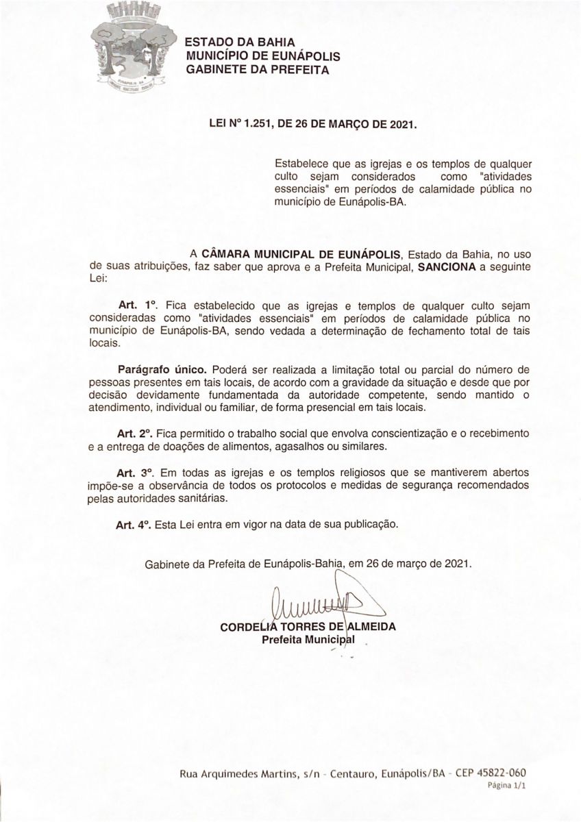 A prefeita de Eunápolis, Cordélia Torres, sancionou lei, na última quinta-feira, 15 de abril, considerando igrejas e templos de qualquer culto como atividades essenciais em períodos de calamidade pública no município. Em todas as igrejas e templos que se mantiverem abertos, há a observância de todos os protocolos e medidas de segurança, recomendados pelos órgãos de saúde.