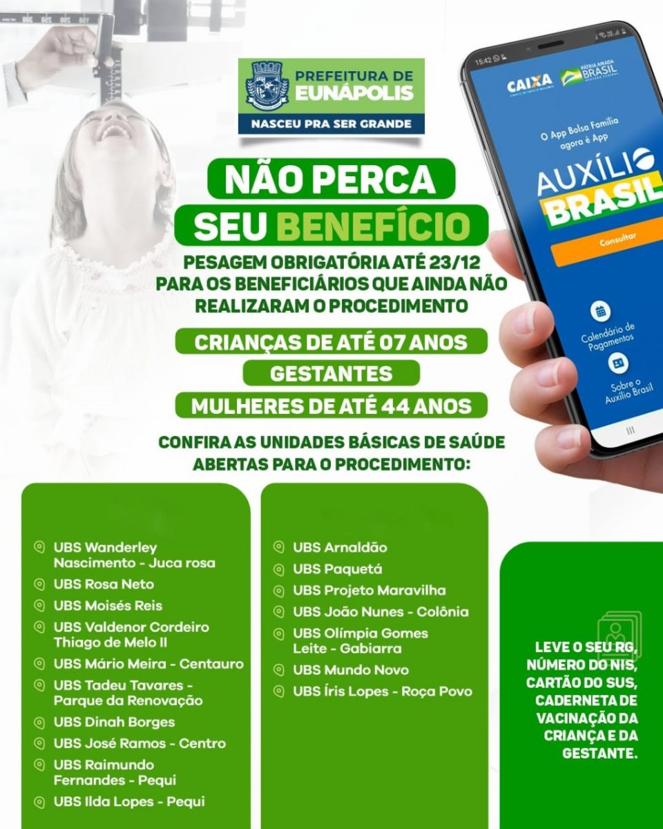 "Os beneficiários devem procurar a unidade mais próxima das suas casas para realizar a pesagem, sob pena de perder o benefício. Então, é importante que todos cumpram essa determinação para continuar garantindo o Auxílio Brasil", alertou a secretária de Assistência Social, Néia Torres.