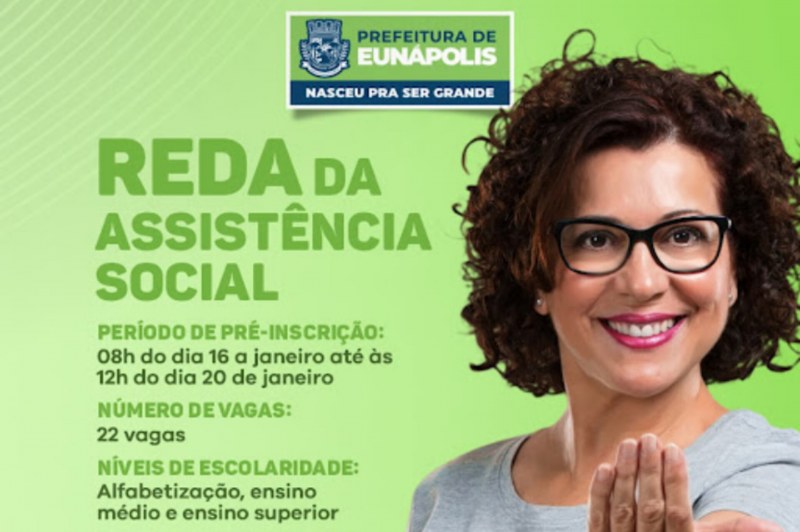 A Prefeitura de Eunápolis abre nesta segunda-feira (16) o REDA (Regime Especial de Direito Administrativo) para preenchimento de cargos da Secretaria Municipal de Assistência Social.