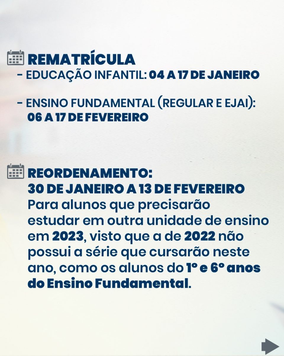 “Pedimos aos pais e responsáveis que compareçam às unidades onde desejam rematricular as crianças o mais breve possível para garantir a vaga para o ano letivo 2023”, frisou a secretária de Educação, Telma Andrade.