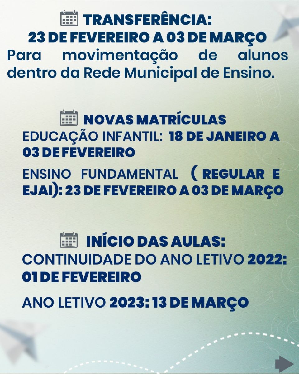 O prazo para renovar a matrícula de estudantes do ensino fundamental e EJAI será de 06 a 17 de fevereiro.