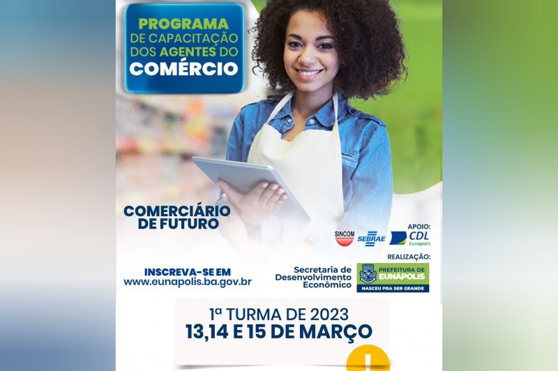Quem trabalha ou deseja trabalhar no comércio tem uma ótima oportunidade para se qualificar. O projeto "Comerciário de Futuro", promovido pela Prefeitura de Eunápolis, por meio da Secretaria Municipal de Desenvolvimento Econômico, disponibilizará palestras com profissionais da área, garantindo qualificação para os trabalhadores que atuam no ramo.