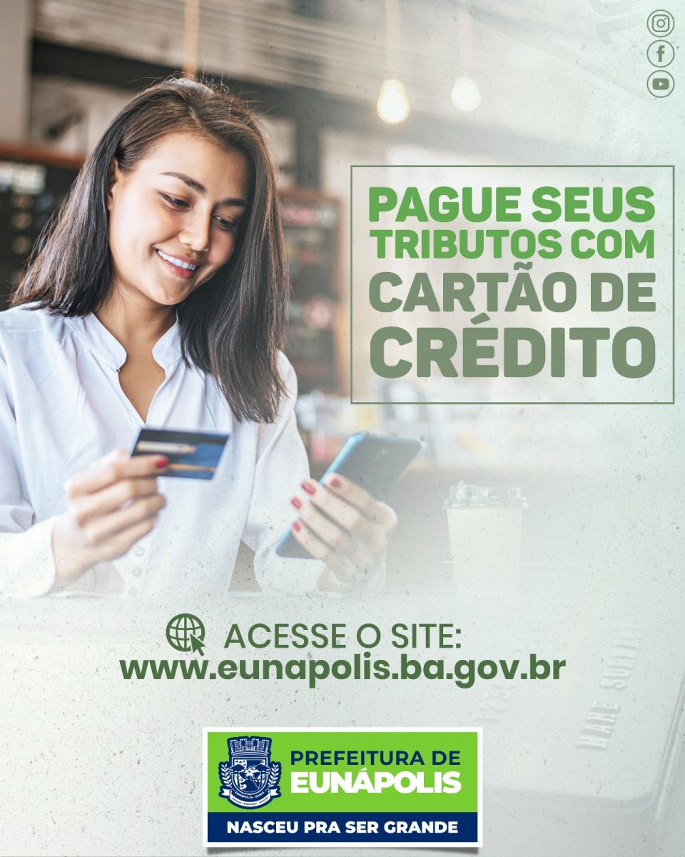 O pagamento dos tributos municipais pelo cartão de crédito deverá ser realizado exclusivamente pelo site da Prefeitura de Eunápolis [www.eunapolis.ba.gov.br].