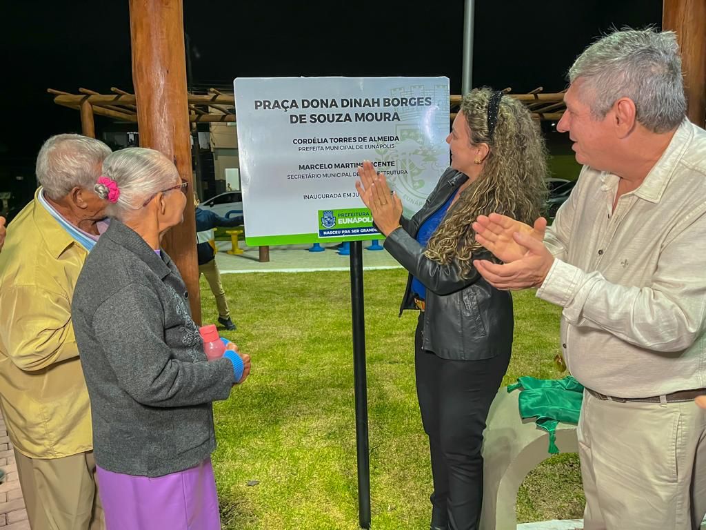 A prefeita de Eunápolis, Cordélia Torres, inaugurou a praça do bairro Alto da Boa Vista na noite desta terça-feira (04), em um evento que contou com a presença de moradores e autoridades locais. A nova praça, que foi intitulada Dona Dinah Borges de Souza Moura, tem sido motivo de comemoração para os moradores, não apenas do bairro em questão, mas também das localidades circunvizinhas.
