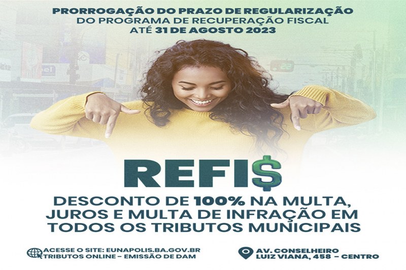 A prefeitura de Eunápolis decidiu prorrogar o prazo para adesão ao Programa de Recuperação Fiscal (REFIS) até o dia 31 de agosto de 2023, com 100% de desconto em multa, juros e multa de infração. A medida foi anunciada nesta sexta-feira (07) pela prefeita Cordélia Torres, que destacou a oportunidade de regularização para os cidadãos que desejam estar em dia com o município.