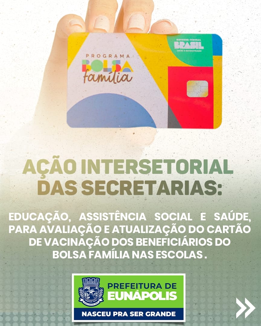A prefeitura de Eunápolis anunciou a realização de uma importante ação intersecretarial que visa à avaliação e atualização do cartão de vacinação dos beneficiários do programa Bolsa Família. A iniciativa, que será coordenada pelas secretarias de Educação, Assistência Social e Saúde, ocorrerá durante quatro dias e contará com postos de atendimento em diversas escolas da rede pública municipal.
