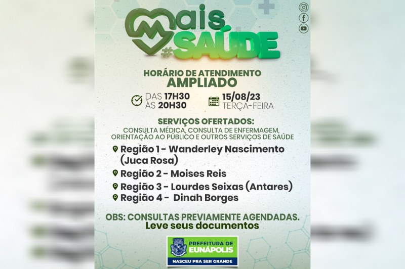 As UBS Wanderley Nascimento (Juca Rosa), Moisés Reis, Lourdes Seixas (Antares) e Dinah Borges estenderão seu horário de funcionamento, permanecendo abertas até as 20h30. Essa medida visa atender às demandas da comunidade que muitas vezes enfrenta dificuldades em buscar atendimento médico durante o período diurno devido a compromissos e responsabilidades.