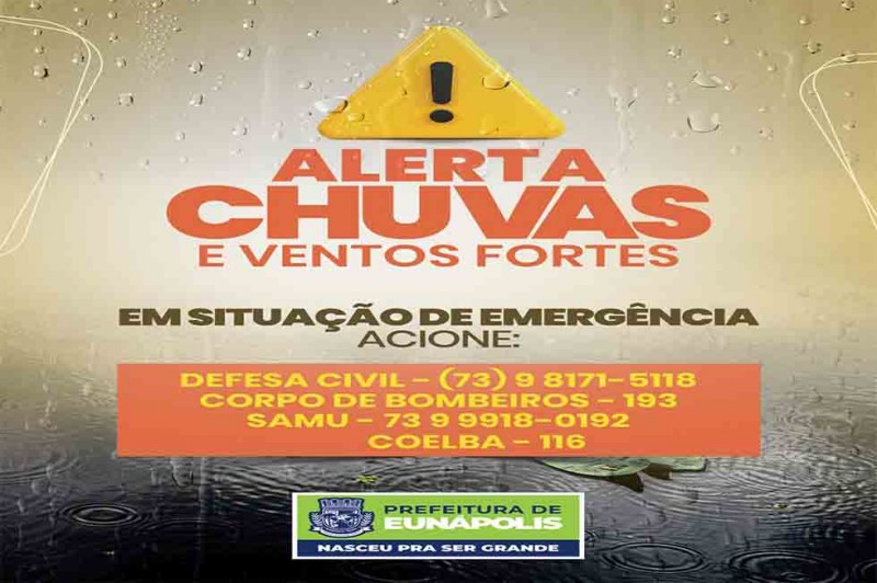 Com o alerta importante emitido pelo Instituto Nacional de Meteorologia - INMET para a região Sul da Bahia, a Prefeitura de Eunápolis, por meio da Coordenadoria de Defesa Civil Municipal, informa que, a partir desta segunda-feira (28), são esperadas chuvas com intensidade variando entre 30 e 60 mm/h ou 50 e 100 mm/dia, acompanhadas por ventos de alta velocidade, oscilando entre 60 e 100 km/h. Essas condições climáticas adversas podem trazer riscos à população e à infraestrutura local.