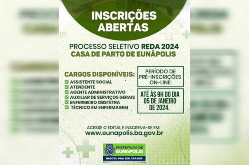 Termina nesta sexta-feira (05) o período de pré-inscricões para o processo seletivo REDA da Prefeitura de Eunápolis, destinado a formar a equipe da futura Casa de Parto, com previsão de inauguração ainda neste início de 2024.