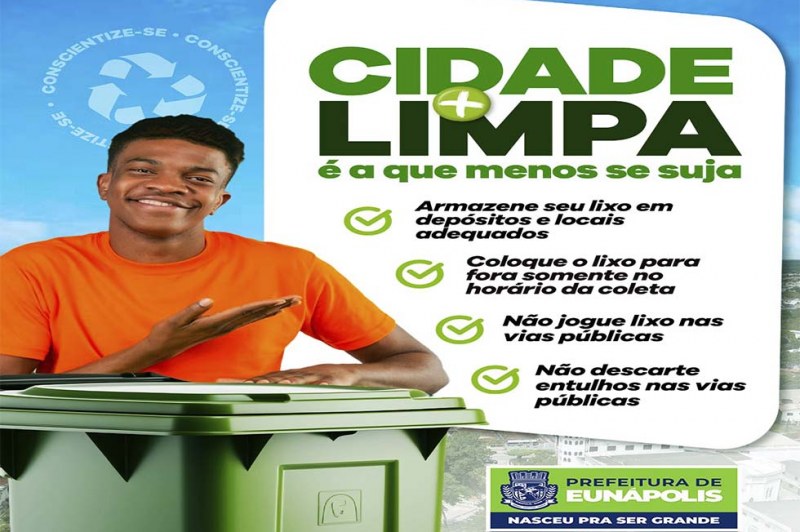 A Prefeitura de Eunápolis lança a campanha "Cidade Mais Limpa é a que Menos se Suja" para reforçar a necessidade urgente de conscientização da comunidade sobre o correto descarte do lixo, principalmente durante o período chuvoso, visando prevenir alagamentos decorrentes da obstrução de sistemas de drenagem e outros transtornos.
