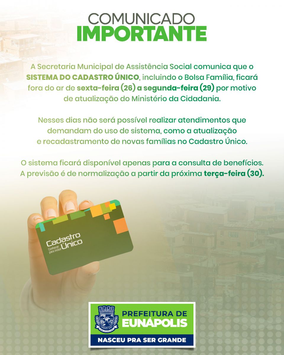 A prefeitura de Eunápolis, por meio da Secretaria Municipal de Assistência Social, informa à população que o sistema do Cadastro Único, que engloba o programa Bolsa Família, estará temporariamente fora do ar. A interrupção, que ocorreu de sexta-feira (26) a segunda-feira (29), se deve à necessidade de atualização por parte do Ministério da Cidadania.