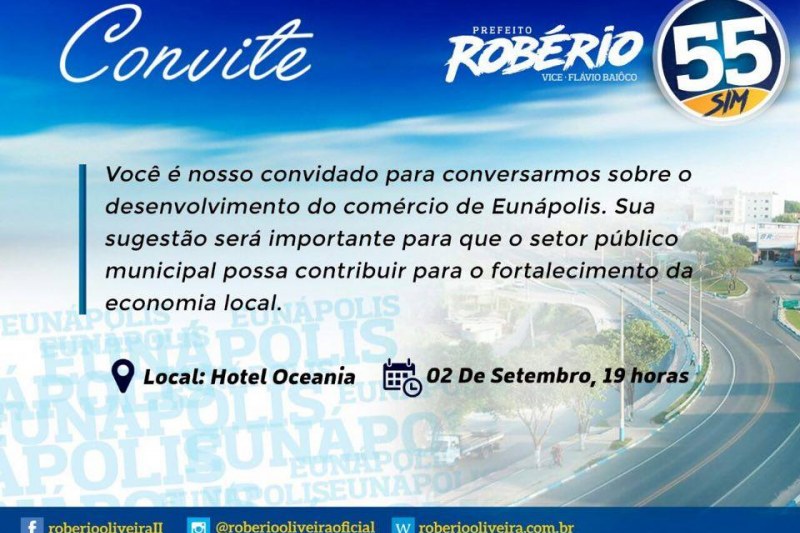 Com finalidade de apresentar suas propostas de governo para o desenvolvimento do comércio local, os candidatos a prefeito e vice da Coligação A Força da União, Robério Oliveira (PSD) e Flávio Baiôco (PTN), realizarão na próxima sexta-feira, 02/09, às 19h, no Hotel Oceania, um encontro aberto a todos os empresários eunapolitanos.