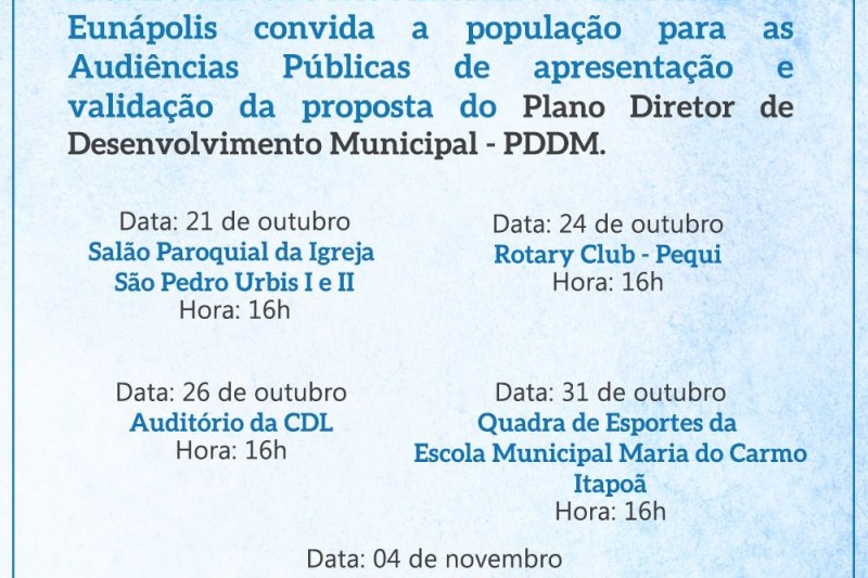 Entre os dias 21 de outubro e 04 de novembro de 2016, a Prefeitura de Eunápolis, através da Secretaria de Meio Ambiente, realizará as Audiências Públicas de apresentação e validação da proposta do Plano Diretor de Desenvolvimento Municipal – PDDM 2014-2024.