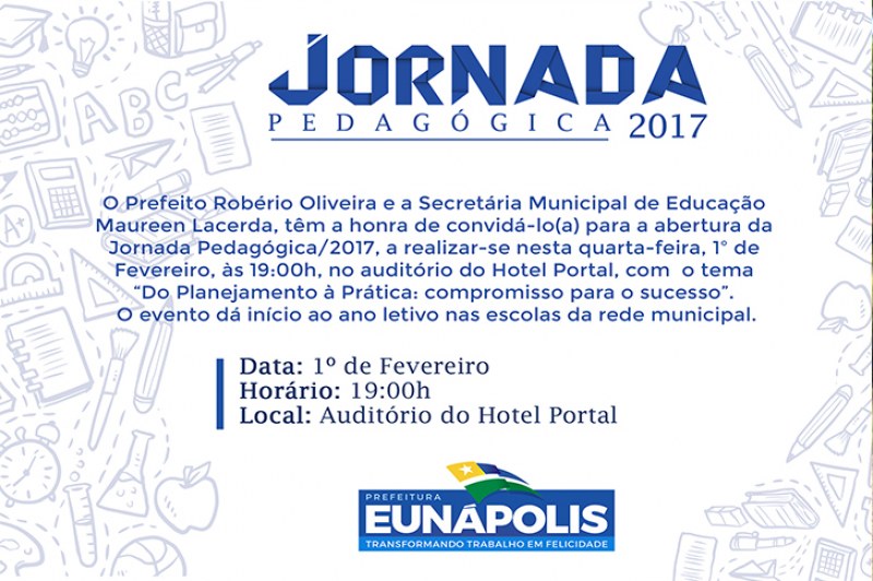 O prefeito de Eunápolis, Robério Oliveira, abre nesta quarta-feira, (1º/02), às 19h, no auditório do Hotel Portal, a Jornada Pedagógica/2017, evento que dá início ao ano letivo nas escolas da rede municipal de Eunápolis. “Nosso compromisso, o meu e o de todos os que são dedicados ao ensino, é fazermos uma educação pública de qualidade sempre melhor, voltada para o sucesso dos cidadãos eunapolitanos”, destaca o prefeito Robério Oliveira, lembrando os muitos desafios que o setor educacional tem pela frente.