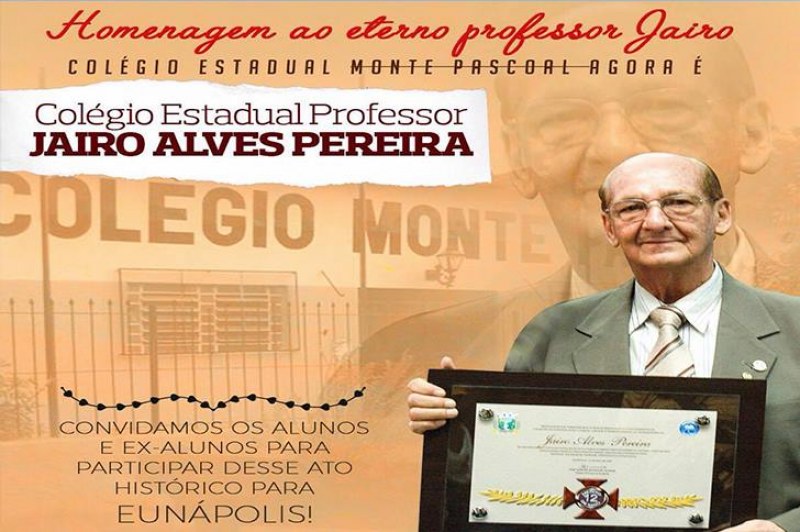 Concedida através do Projeto de Lei Nº 21143/2015, do então deputado estadual Robério Oliveira, atual prefeito de Eunápolis, a alteração do nome da instituição de ensino para Colégio Estadual Professor Jairo Alves Pereira é uma justa homenagem a um dos maiores educadores da história do município.