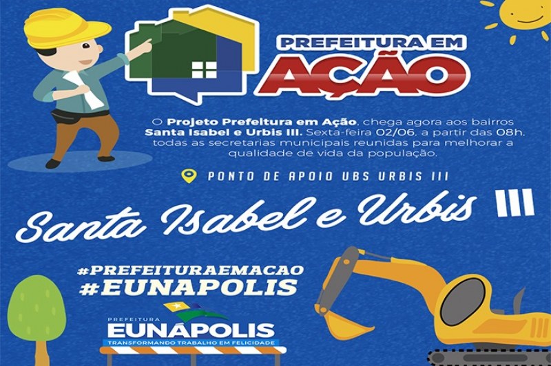Devido às chuvas da última semana, o projeto Prefeitura em Ação chega nesta sexta-feira, 02/06, aos bairros Urbis III e Santa Isabel. Levando os serviços de todas as secretarias municipais para estes dois bairros, a concentração acontecerá na Unidade Básica de Saúde da Urbis III, a partir das 08h.