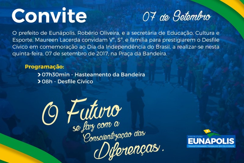 "Vamos realizar um desfile digno da importância da data para todos os munícipes". Com esta visão da secretária Municipal de Educação, Cultura e Esporte, Maureen Lacerda, a administração municipal de Eunápolis prepara o desfile do Dia 7 de Setembro, seguindo a tradição de 29 anos do Município.