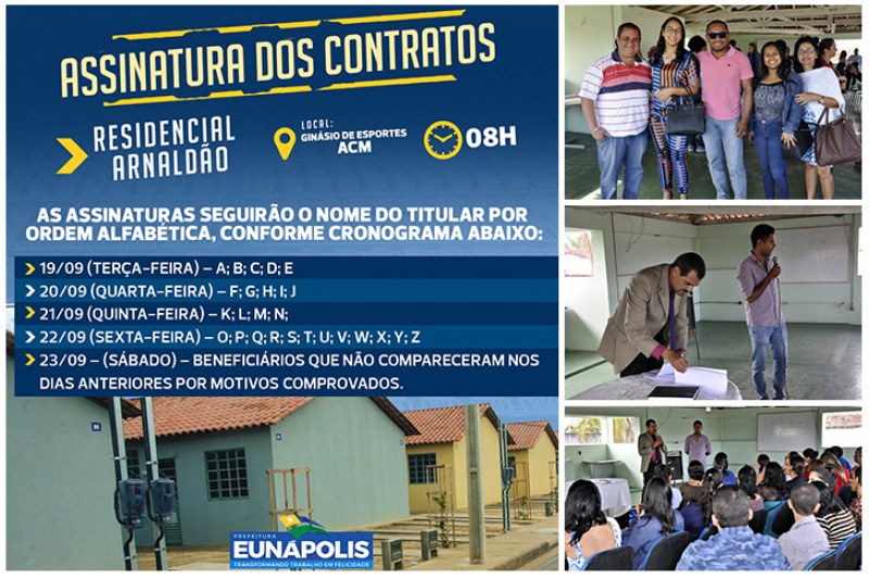 Seguindo cronograma determinado pelo Banco do Brasil, as assinaturas acontecerão entre os dias 19 e 23/09, no Ginásio de Esportes ACM, no bairro Centauro, a partir das 08h, onde os beneficiários assinarão também os contratos com a Coelba e Embasa, presentes no local.