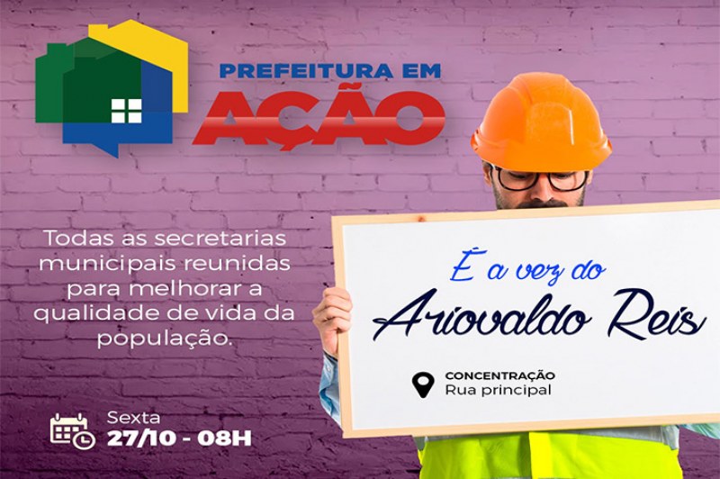O projeto Prefeitura em Ação desta semana acontecerá nesta sexta-feira, 27/10, no bairro Ariovaldo Reis, reunindo os serviços de todas as secretarias municipais, a partir das 08h, com ponto de concentração na rua principal do bairro.