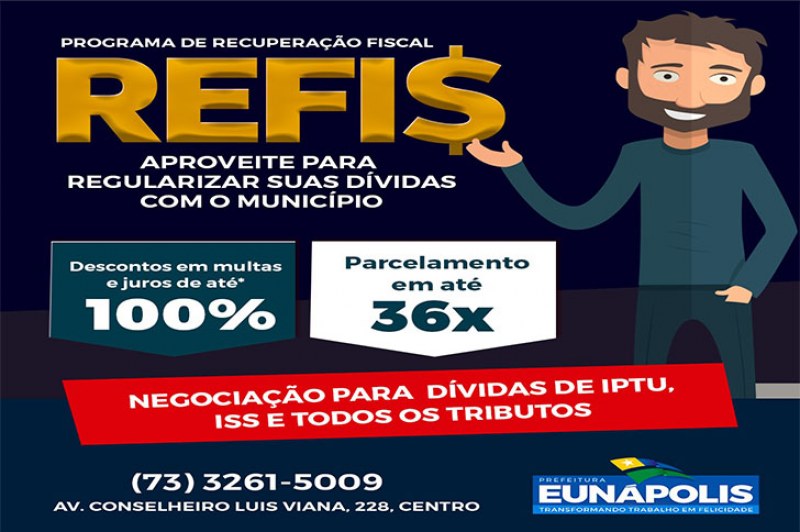 O prazo para adesão ao Refis – Programa de Recuperação Fiscal, instituído pela Lei Municipal Nº 1.127, de 20 de outubro de 2017, continua em vigor em Eunápolis até 30/04. O Refis oferece aos contribuintes inscritos na dívida ativa a possibilidade de regularizar débitos tributários, como o Imposto Predial e Territorial Urbano – IPTU, Imposto sobre Serviço de Qualquer Natureza – ISSQN, além das taxas em geral.