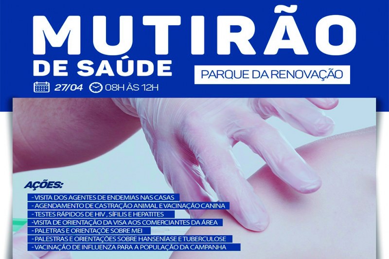Na manhã deste sábado (27/04), a Prefeitura de Eunápolis, por meio da Secretaria de Saúde, realizará no Parque da Renovação um grande mutirão de vigilância em saúde. A ação acontecerá no Centro Comunitário do residencial, a partir das 08h, ofertando à população do bairro diversas ações gratuitas de saúde pública.