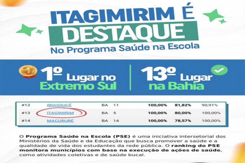 Gestão do prefeito Luizinho conquista mais um importante feito, o 1ª Lugar entre os município da Costa do Descobrimento e o 13º lugar entre os 417 municípios baisno no ranking do PSE - Programa Saúde na Escola. A premiação foi realizada em parceria entre as áreas de Saúde e Educação do estado da Bahia.