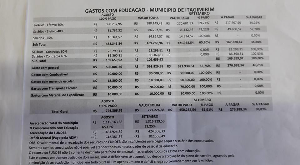 A intenção desta nota é apresentar à população a arecardação da Secretaria Municipal de Educação de Itagimirim, que, desde a aprovação do "Plano de Carrreira" é menor que a folha da referida secretaria. A secretaria informa ainda que atendendo o Ofício 17/2016 da APLB de Itagimirim que condiciona o fim da greve ao pagamento dos salário setebro/2017 - FUNDB 60% e 40% confirma que o pagamento foi efetuado na manhã desta quinta-feira 10/11.