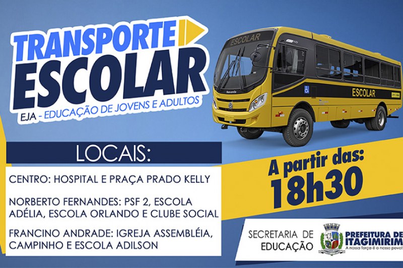 A prefeitura de Itagimirim, por meio da Secretária Municipal de Educação, comunica a todos os alunos do EJA - Educação de Jovens e Adultos, que a partir de hoje, terça-feira 04/04, estará funcionando o transporte escolar para os mesmos.