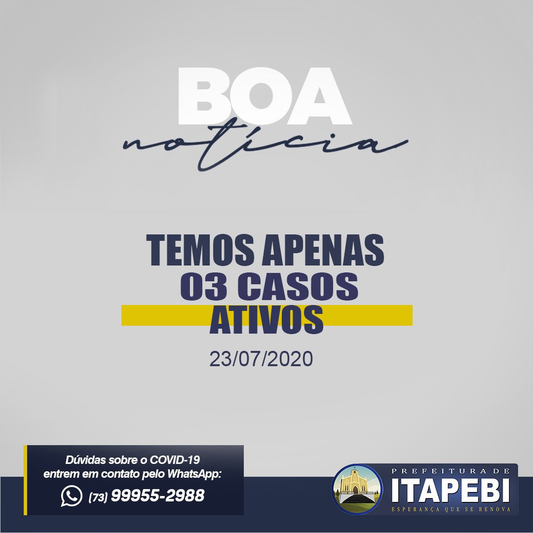 O novo Boletim Epidemiológico divulgado às 19:00 desta quinta-feira 23/07, pela prefeitura de Itapebi, através da Secretaria Municipal de Saúde, destaca que atualmente existe apenas 03 casos ativos do Novo Coronavírus. A cidade já registrou um total de 123 casos confirmados, dos quais 117 estão curados, 03 ativos e 03 óbitos.
