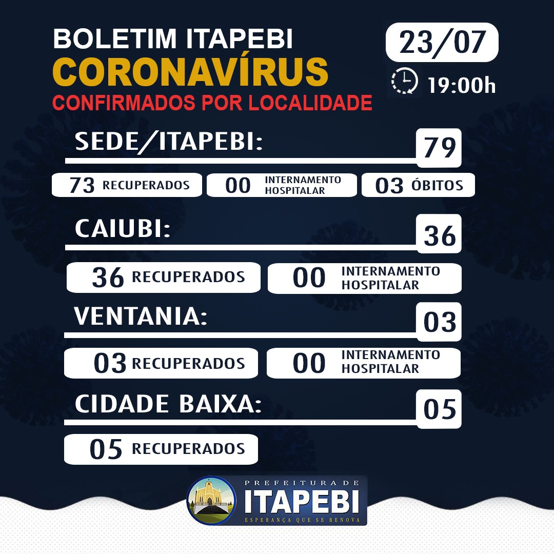 Dentre os 123 casos, 79 foram registrados na sede (73 curados, 03 ativos e 03 óbitos), 36 no Distrito de caiubi (36 curados), 03 no Distrito de Ventania (03 curados) e 05 casos na cidade Histórica (05 curados). A prefeitura de Itapebi, através da Secretaria de Saúde e Vigilância Sanitária está aguardando o resultado de exames de 06 pacientes (05 na sede, 01 no Distrito de ventania, 00 no Distrito de Caiubi e 00 na Cidade Histórica) e segue em monitorando 55 casos suspeitos.