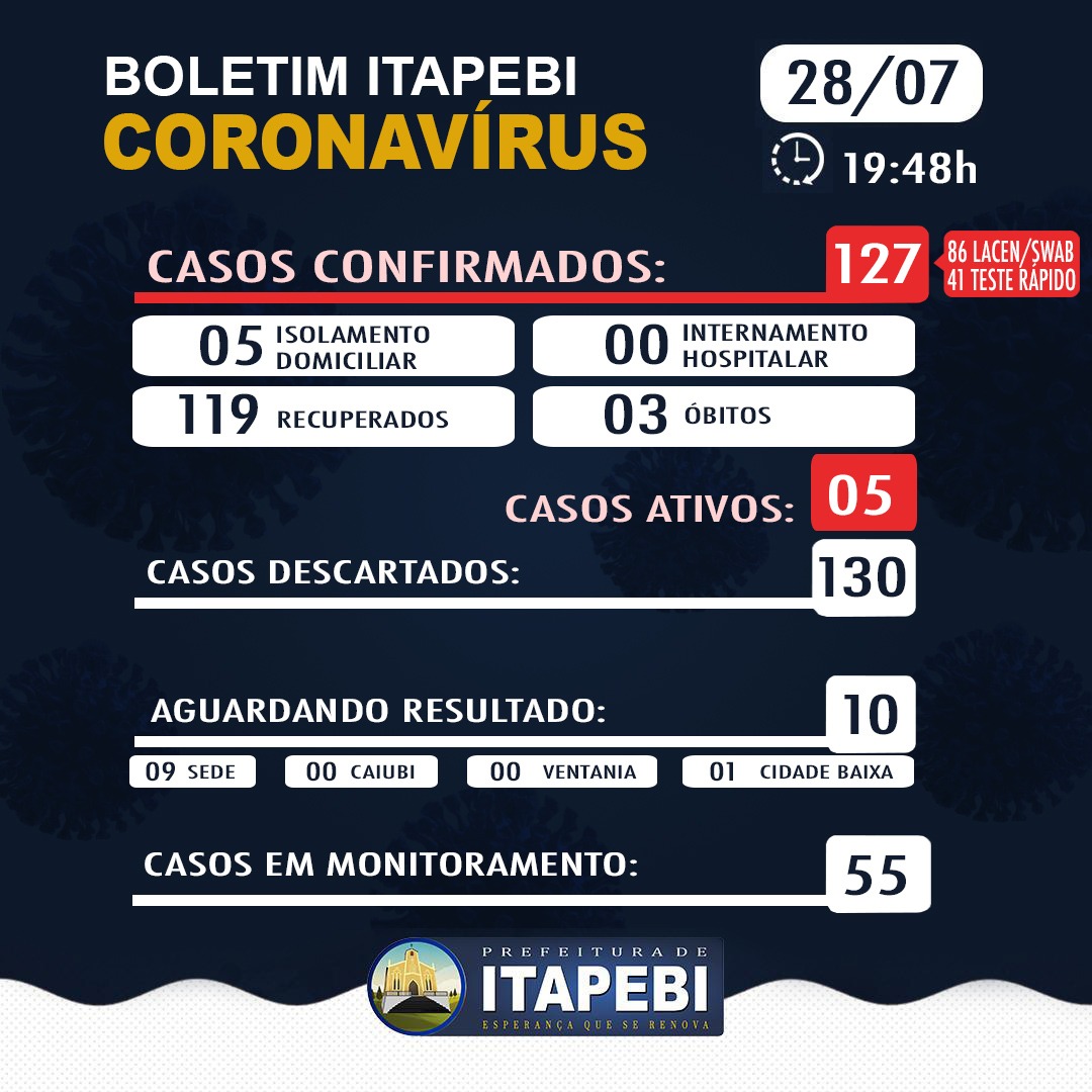 O novo Boletim Epidemiológico divulgado às 19:48 desta terça-feira 28/07, pela prefeitura de Itapebi, através da Secretaria Municipal de Saúde, destaca que atualmente existe apenas 05 casos ativos do Novo Coronavírus. A cidade já registrou um total de 127 casos confirmados, dos quais 119 estão curados, 05 ativos e 03 óbitos.