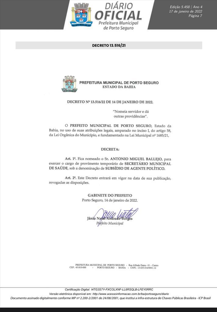 O prefeito de Porto Seguro, Jânio Natal, realizou, na manhã desta segunda-feira, 17, uma mudança estratégica na gestão municipal. Miguel Ballejo que ocupava a função de interino na Secretaria da Saúde, passa a ser o titular da Pasta, com a missão de gerir um dos mais complexos setores da administração.