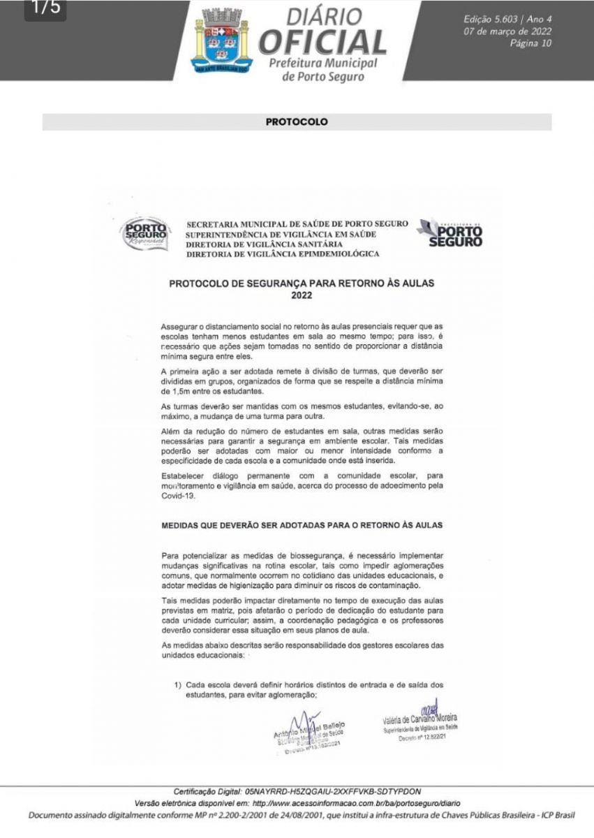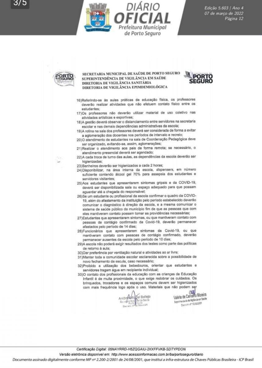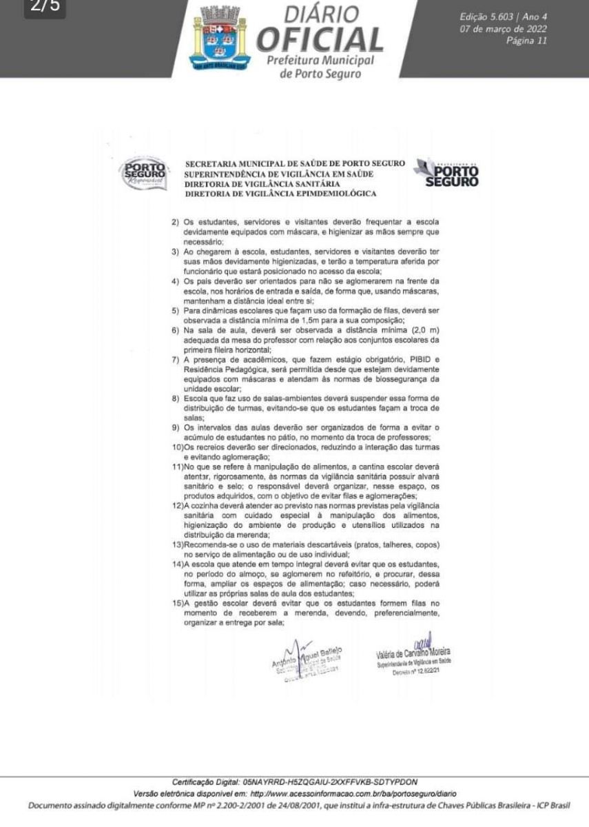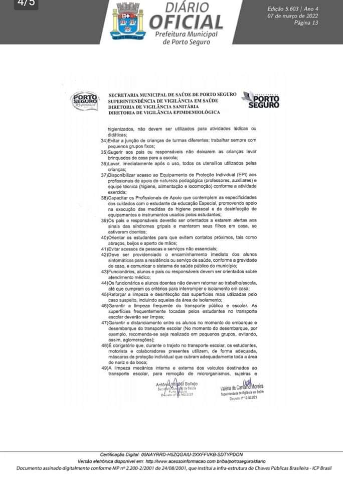 Marcada para reinício a partir de hoje, 7 de março, a maioria das esolas de rede municipal de ensino já retomaram as atividades presenciais seguindo os protocolos sanitários de saúde contra o coronavírus. Além da exigência do uso de máscaras, distanciamento, disponibilização de álcool em gel, a Prefeitura de Porto Seguro está instalando totens de higienização para alunos, professores e pessoal de apoio.