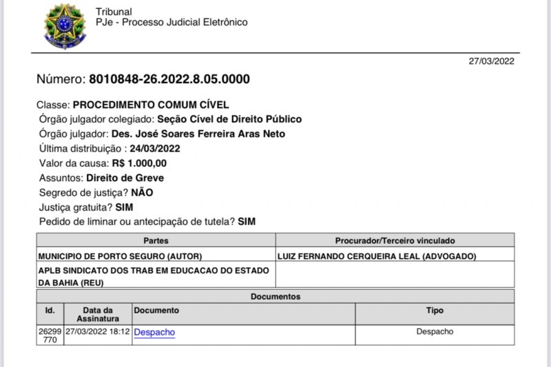 O desembargador José Soares Ferreira Aras Neto, do Tribunal de Justiça da Bahia, julgou ilegal a greve deflagrada na Educação do município pela APLB (Sindicato – Delegacia Costa do Descobrimento), determinando o retorno imediato dos profissionais às salas de aula sob pena de multa diária de R$ 1.000,00. A paralisação estava marcada para esta segunda-feira, 28, e trazia na pauta reivindicações como o reajuste salarial de 33,24% e melhores condições das escolas.