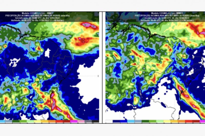 São previstos totais acumulados superiores a 100 mm diários em algumas localidades destas regiões. Os acumulados no período devem ultrapassar 200 mm em algumas cidades.