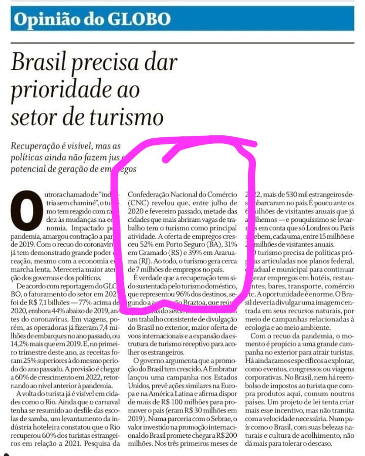 A pesquisa da Confederação Nacional do Comércio-CNC, divulgada no Jornal O Globo, mostra que Porto Seguro teve um crescimento de 52% na oferta de emprego, à frente de municípios como Gramado-RS (31%) e Araruama-RJ (39%). Ao todo, o turismo gera cerca de 7 milhões de empregos no país.