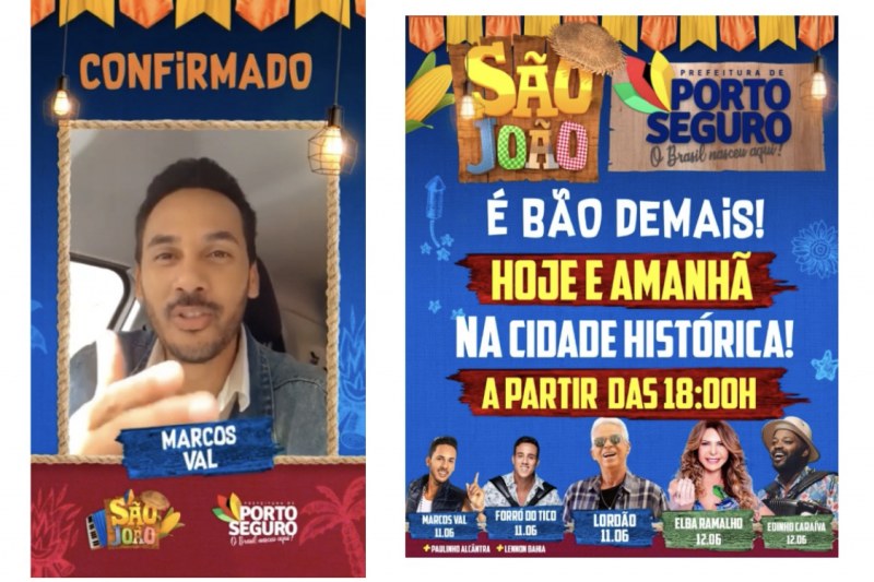 Este ano Porto Seguro inova com os festejos de são João, para começar a festa tem inicio no dia 11 de Junho na Cidade Histórica com uma programação inovadora, intitulado como o Arraiá em homenagem a nossa querida Elba Ramalho moradora da Cidade que ira ser madrinha de mais de cem casais de noivos que farão o juramento de amor eterno dentro dos festejos de São João. Um dos destaques na abertura deste dia 11 é o cantor Marcos Val que irá apresenta um repertório especial com destaque para o forró nordestino e nacional, alem da participação da Banda Lordão, Forro do Tico e outras atrações que irão abrilhantar ainda mais a festa, em uma mega estrutura montada no estacionamento da Cidade Histórica.