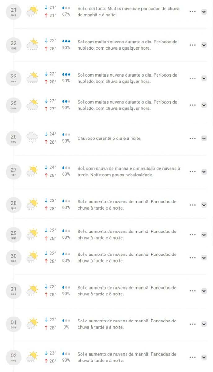 Para a Região Sul, os volumes de chuva podem passar de 50 mm no litoral de Santa Catarina e do Paraná. Nas demais áreas, há “possibilidade de pancadas de chuva no início da semana, com predomínio de tempo seco e sem chuvas nos dias seguintes”.