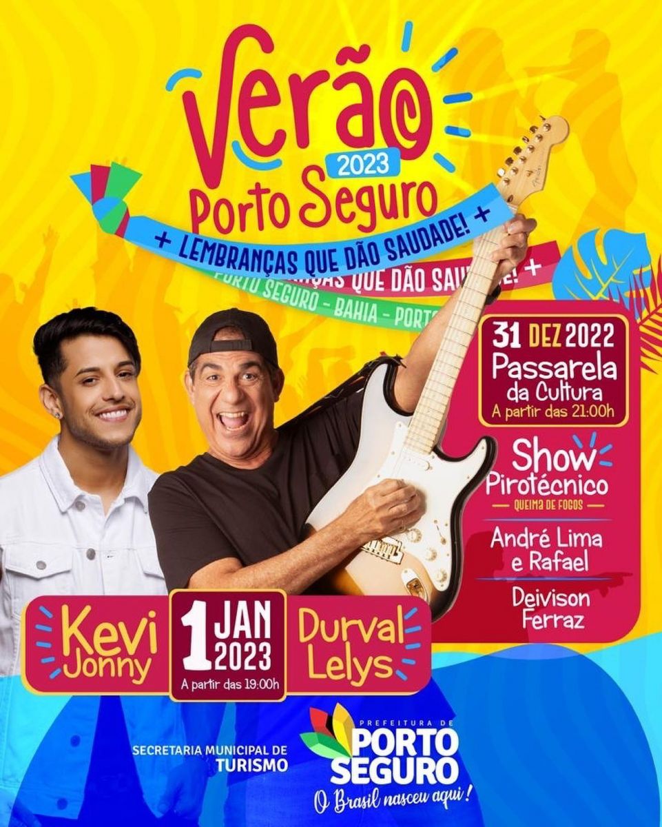 A prefeitura de Porto Seguro está preparando uma grande festa para comemorar a chegada do NOVO ANO. Na Passarela da Cultura, moradores e turístas vão celebrar a chegada de 2023 com um grande SHOW PIROTÉCNICO e show musical com Deivison Ferraz e André Lima e Rafael.
