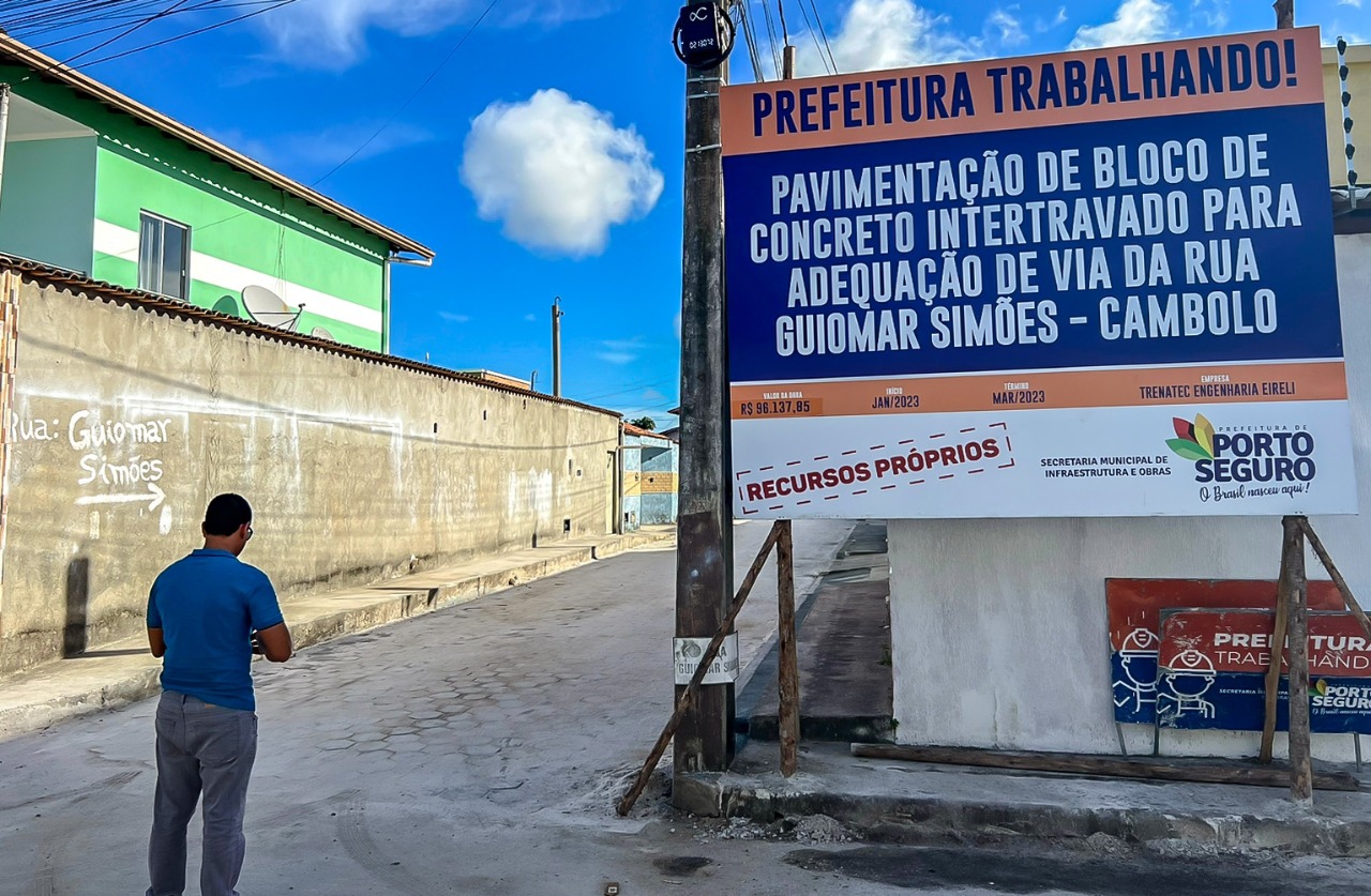 A prefeitura de Porto Seguro segue utilizando os recursos públicos com responsabilidade, visando antender as expectativas dos contribuintes. As obras de pavimentação do bairro Cambolo seguem beneficiando os moradores da comunidade. Já foi concluída a pavimentação com bloquete intertravado das Ruas Marta Kruger e Guiomar Simões.