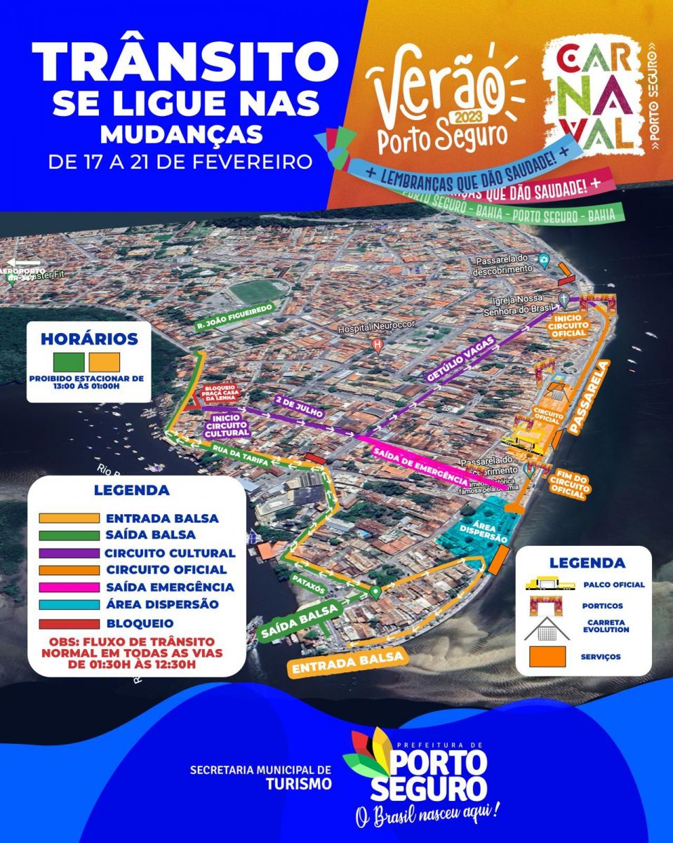 Sinalizações específicas e um mapa indicam ruas liberadas, vias com regras de horários liberados para trafegar, saídas de emergência, áreas de dispersão e as de bloqueio, rota do circuito cultural, entrada e saída da balsa.