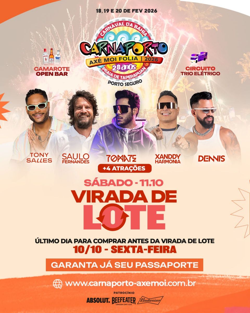 Já temos 5 atrações confirmadas: Xanddy Harmonia, Tony Salles, Saulo Fernandes, Tomate e Dennis! E ainda faltam 4 atrações, de nível nacional, a serem convocadas para essa festa! Serão 3 noites de muita diversão: Dias 18, 19 e 20 de fevereiro de 2026 na Arena Axé Moi, em Porto Seguro - Ba! Haja fôlego para tanta folia!