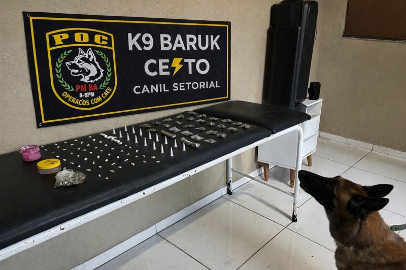 Com o apoio do cão farejador K9 Baruk, foi realizada varredura em um terreno baldio, onde o animal indicou um ponto específico. No local, foram encontrados recipientes contendo entorpecentes.