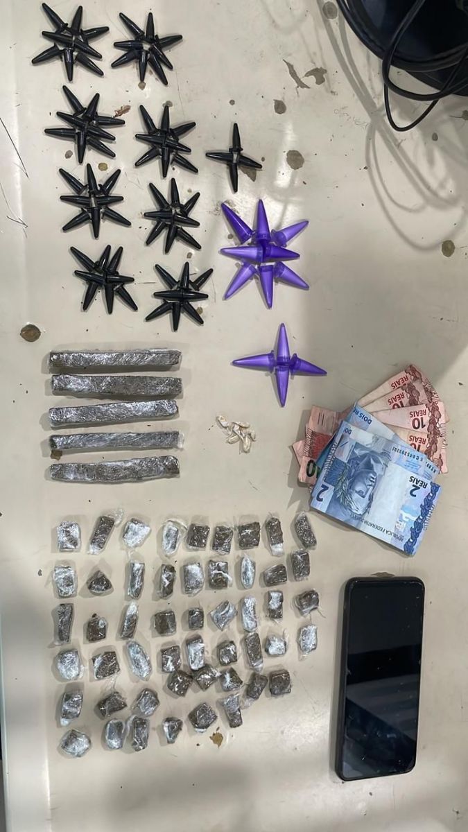 Durante rondas ostensivas no bairro Gravatá, a guarnição avistou um indivíduo que, ao perceber a aproximação da viatura, tentou ocultar uma sacola em uma moita. Ao proceder com a abordagem e verificação do material, foram encontrados diversos entorpecentes.
