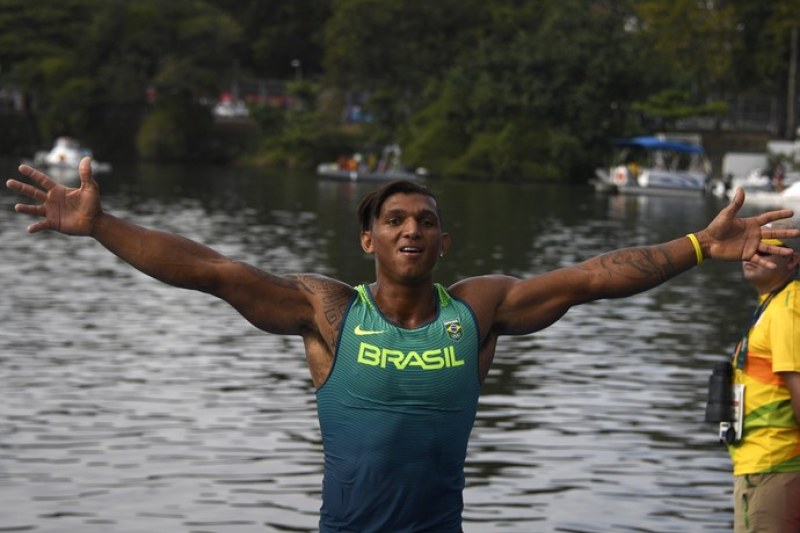 Na Lagoa Rodrigo de Freitas, Isaquias Queiroz festeja a medalha de prata no C1 1000m (Foto: AFP)