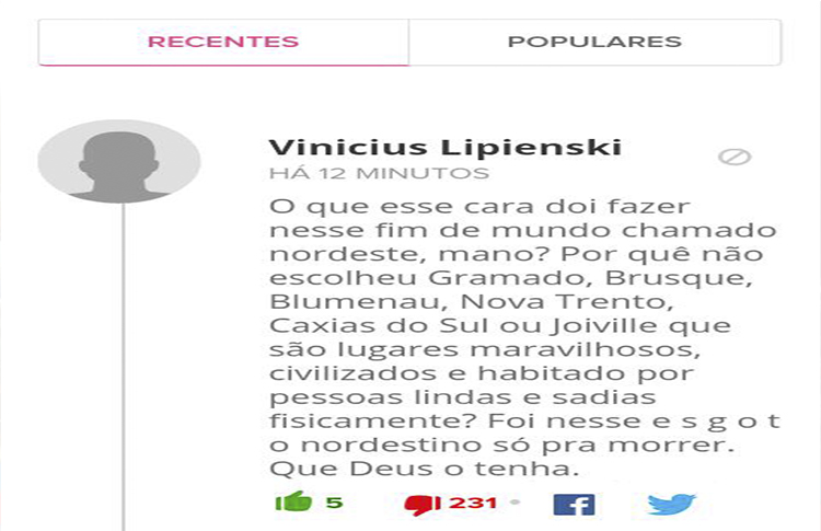Uma postagem racista que “sugere” autoria do Juiz Federal Marcos Vinícius Lipienski viralizou na internet e está rendendo grande repercussão no Nordeste e em todo o Brasil. A postagem em uma rede social de “Suposta” autoria do magistrado refere-se ao Nordeste como “Fim de Mundo” e “Esgoto”.
