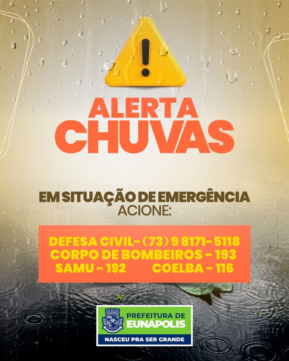 A Prefeitura de Eunápolis, por meio da Coordenadoria da Defesa Civil, alerta os eunapolitanos para previsão de fortes chuvas a partir desta quinta-feira (20). As chuvas podem ultrapassar o índice de 100 milímetros, o que pode provocar perigo à população, além da possibilidade de alagamentos e deslizamentos de terra, principalmente em áreas de risco.