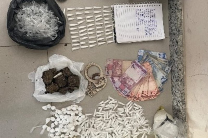 Durante acompanhamento e incursão, a guarnição se deparou com uma mulher e um homem, este conseguiu fugir e no local foram localizados: 01 câmera de vídeo monitoramento; 70 trouxas de cocaína pesando 65 gramas, R$ 192,00 reais em espécie, 01 aparelho celular Motorola roxo, 01 algema, 39 pedras de Crack pesando 18 gramas, 01 pedaço de maconha pesando 99 gramas, 207 pinos com cocaína pesando 124 gramas, 03 embalagens com tubos de ependorfs vazios, 01 faca, 01 caderno com anotações de venda de drogas, 01 pacote com embalagens plásticas.