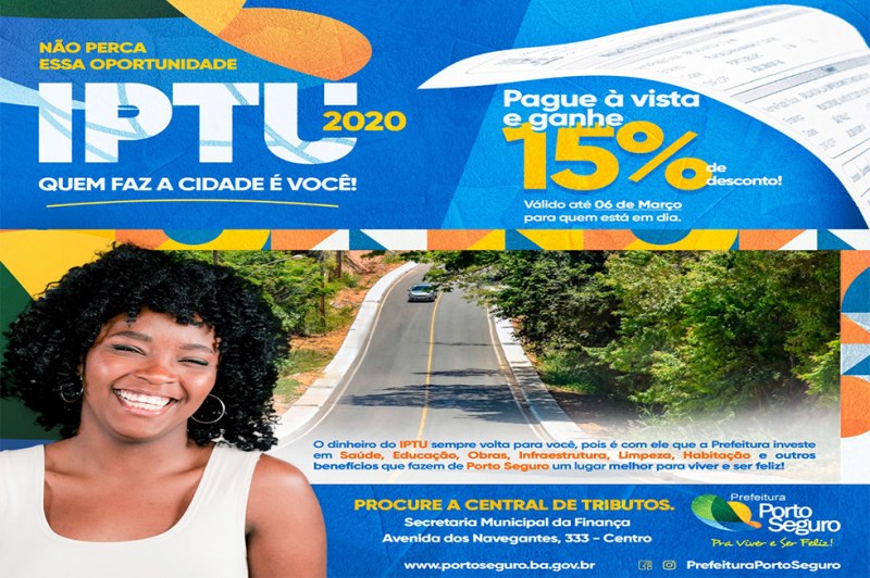 O pagamento antecipado do IPTU é uma excelente oportunidade de obter desconto e contribuir para o desenvolvimento do município, pois é com recursos como este que a Prefeitura de Porto Seguro realiza obras, reformas, construções, manutenções das escolas, praças, postos de saúde, pavimentação e muitos outros serviços.